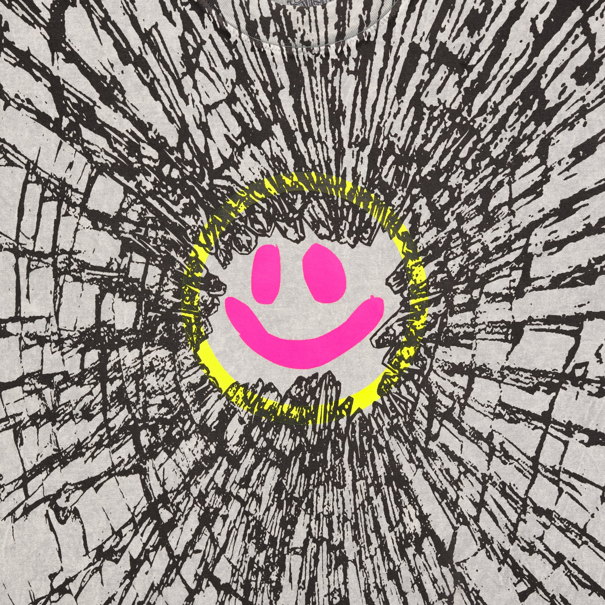 - Seam-to-seam fluorescent yellow evil smiley on reverse