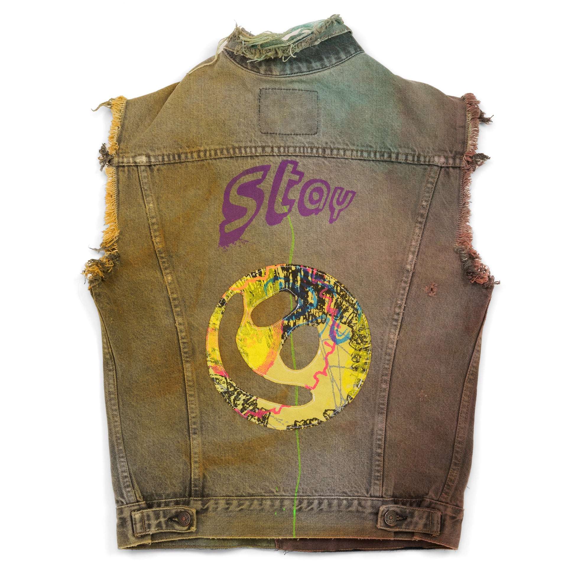 Sleeveless, cut-off jean vest. Features 2 laser-cut smiley appliqué patches, a printed patch-work pocket, a square studio-rag smiley patch, and 4 print-placements.