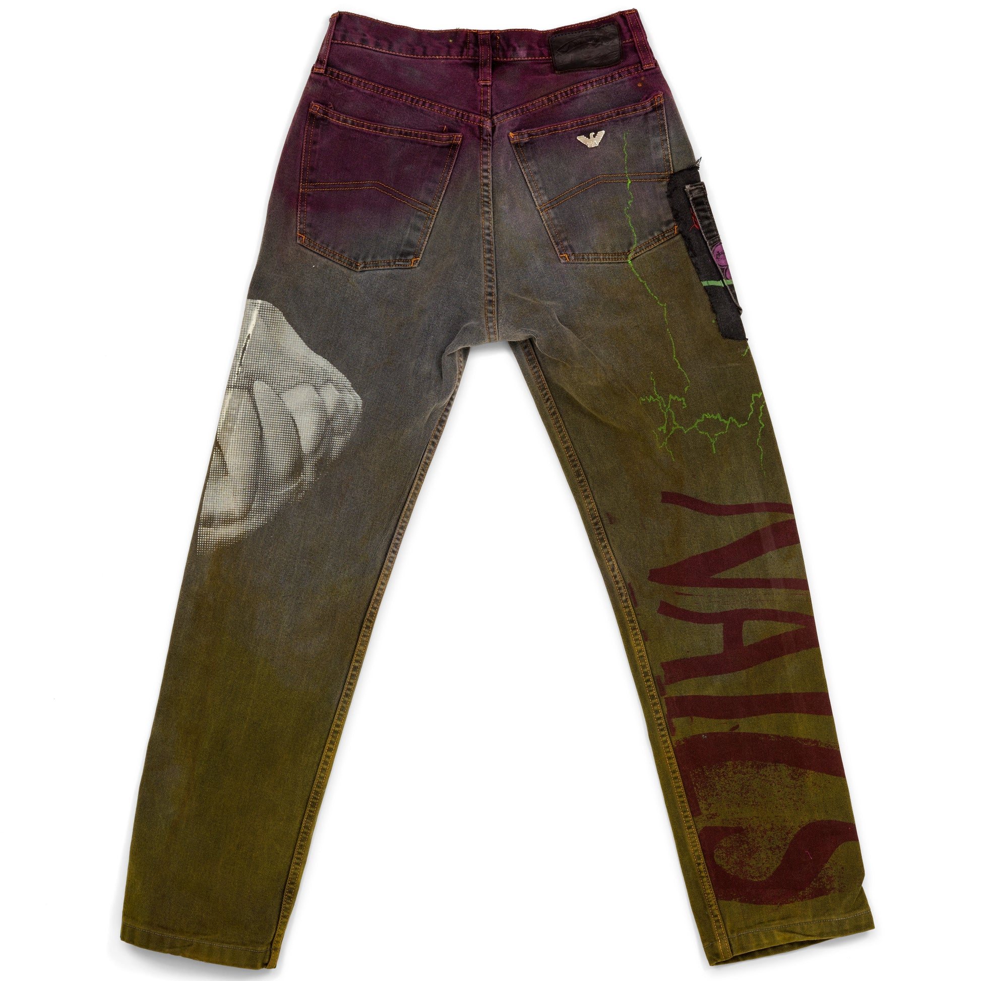 Armani jeans with button fly. Features a sewn on printed patchwork pocket & a square studio-rag smiley patch, along with 5 print-placements