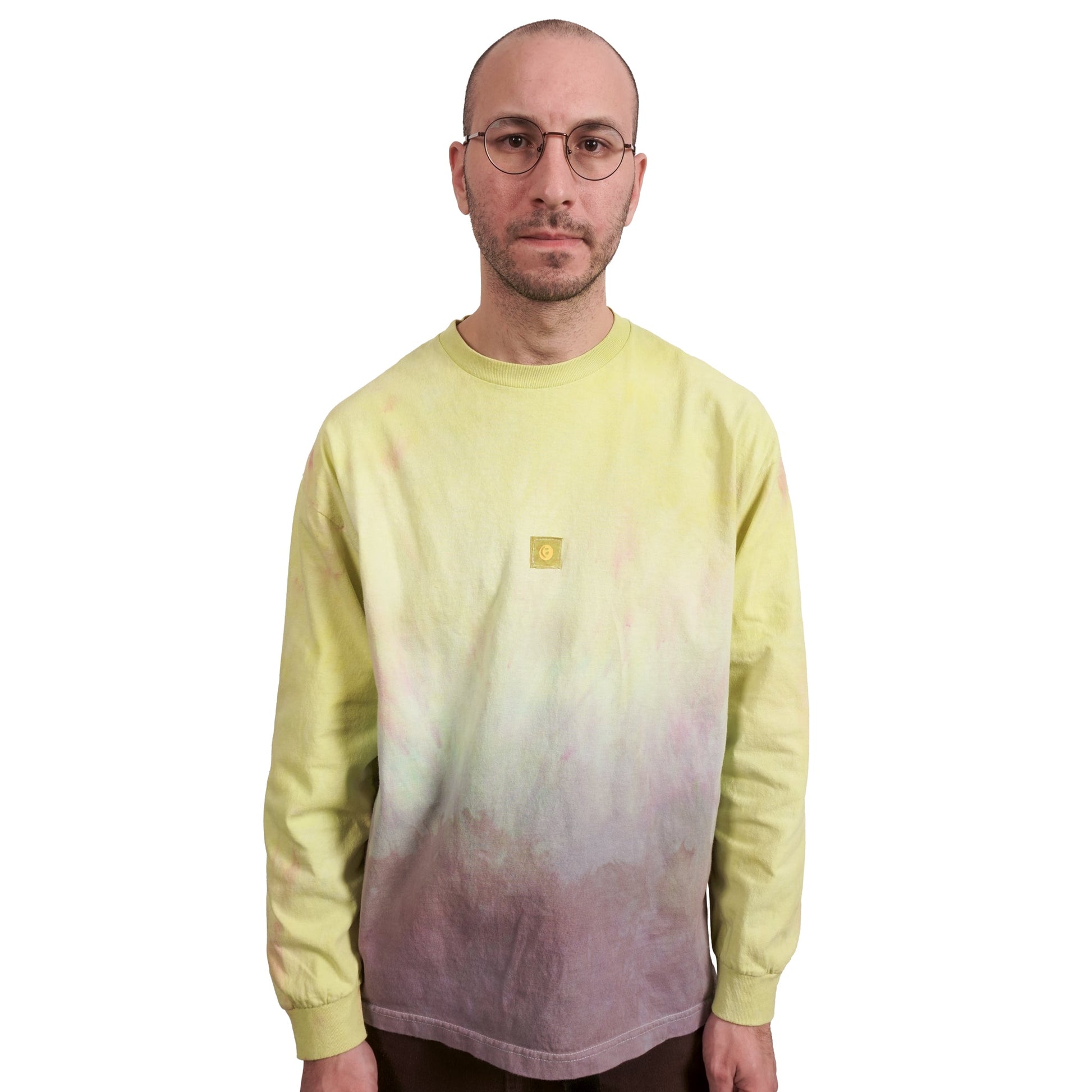 Garment body: low-water ombré dyed from dirty purple to pastel mustard yellow