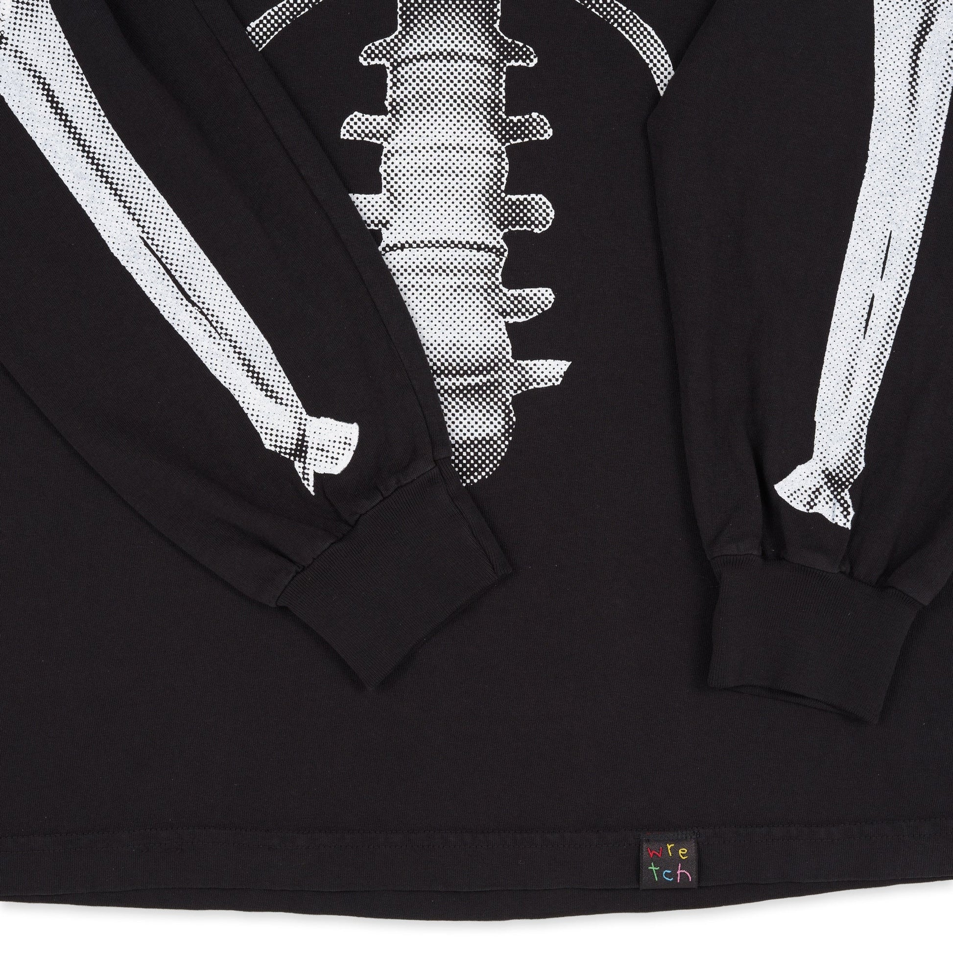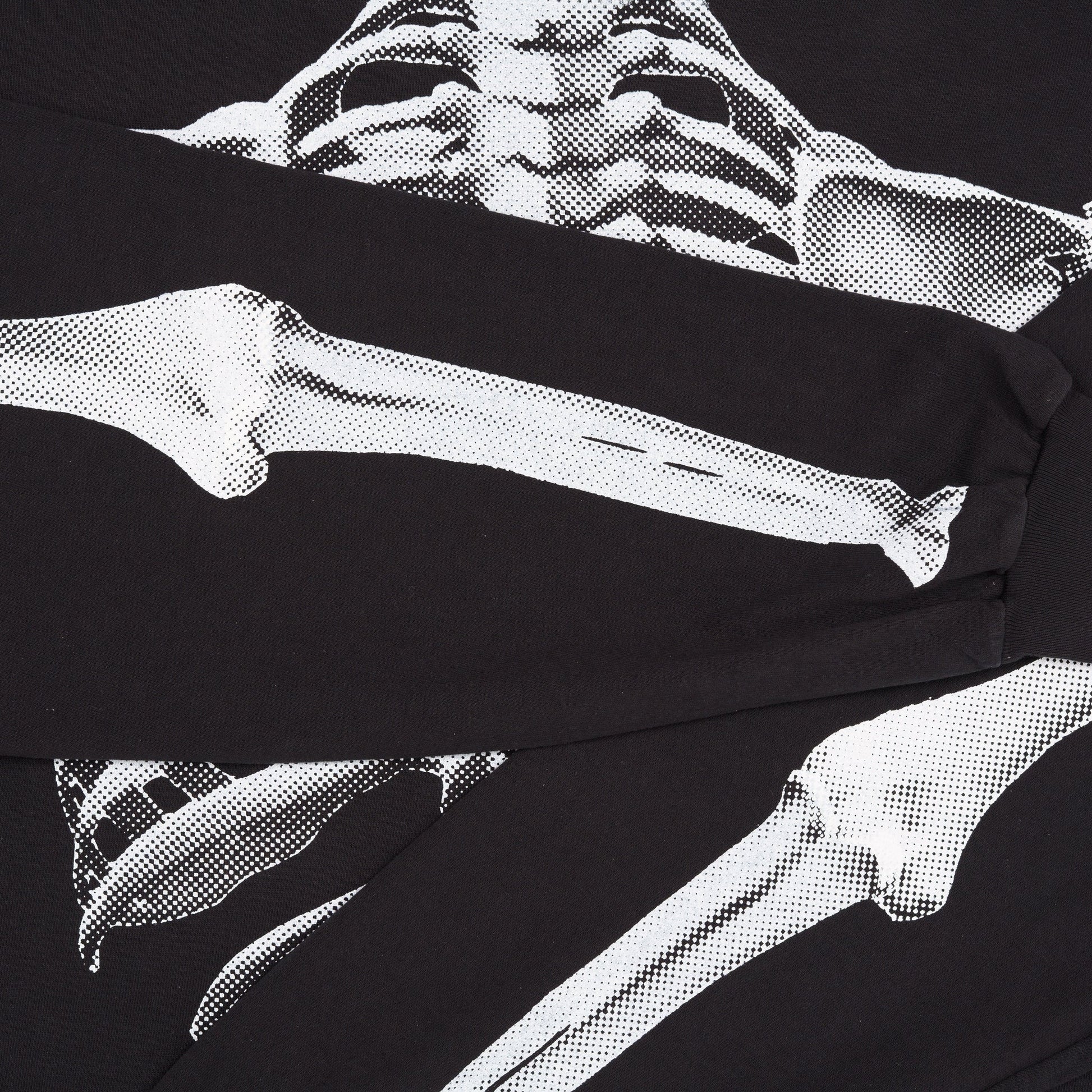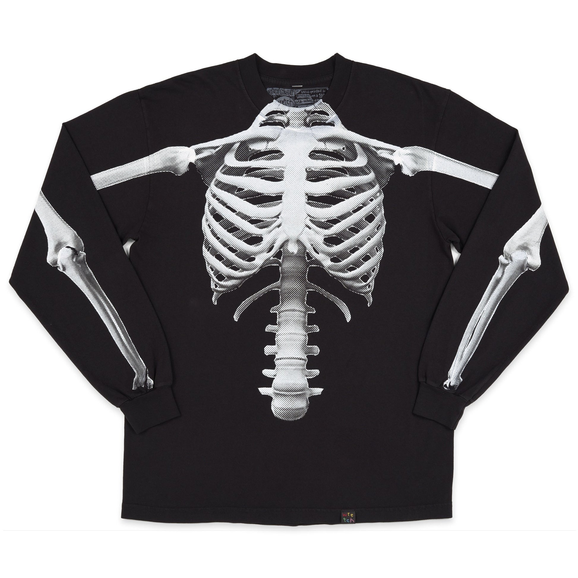 Skeleton graphics size up along with each sizing from Small to XL. The torso & each arm are printed separately to create slight placement variations, subtle print overlap, & underlying sense of movement between the parts.