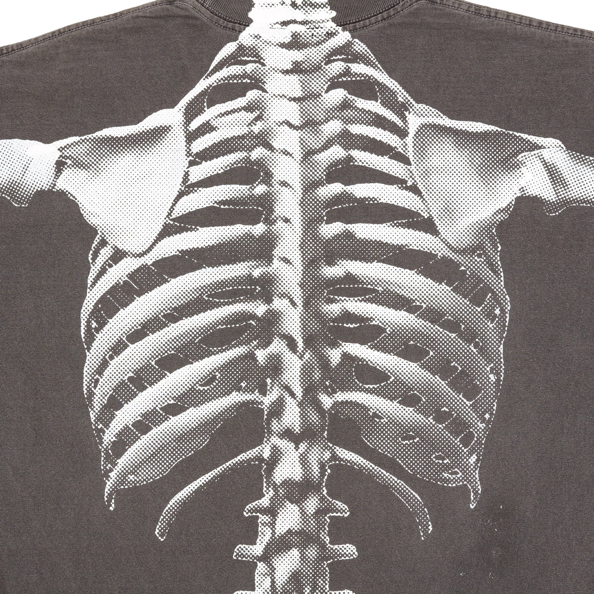 Skeleton graphics size up along with each sizing from Small to XL. The torso & each arm are printed separately to create slight placement variations, subtle print overlap, & underlying sense of movement between the parts.